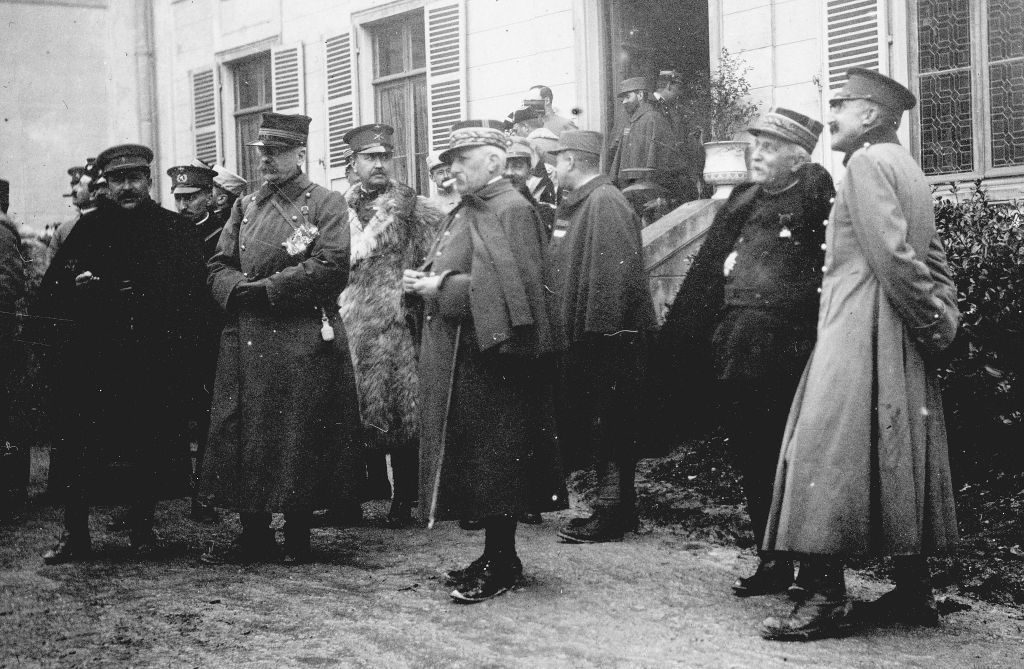 cour d’un château, un grand rassemblement d’officiers dont beaucoup portent des