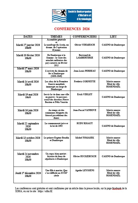 Cette conférence d’Olivier Vermesch fera suite à l’assemblée générale de la Société Dunkerquoise d’histoire et d’Archéologie qui se déroulera à 18h00.